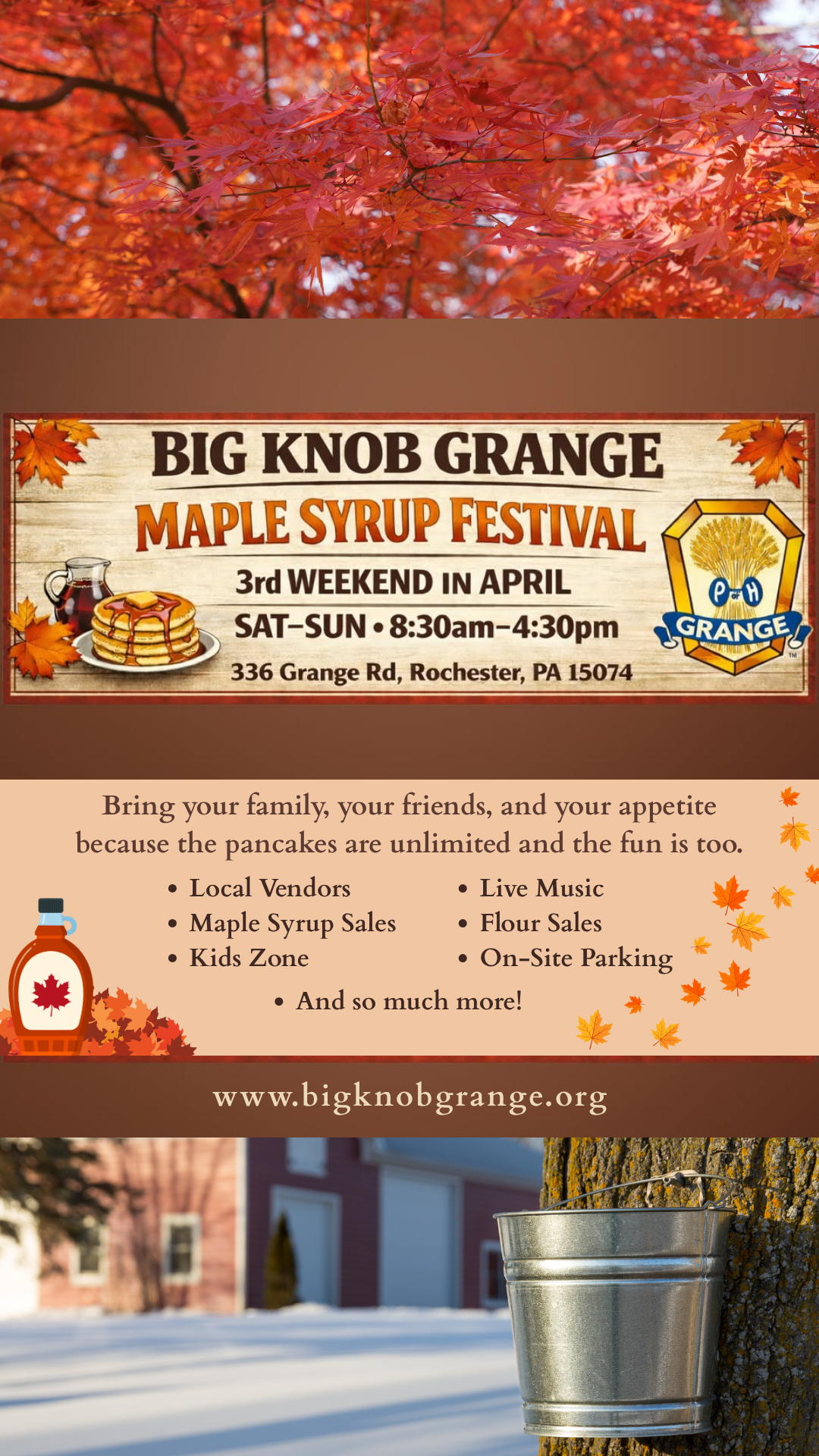 Many of you have heard that the Beaver County Maple Syrup and Music Festival held by PUSH Beaver County was cancelled for 2026. The GREAT NEWS is that Big Knob Grange has stepped in and will still be holding a Maple Syrup Festival on April 18 & 19, 2026. The venue has changed from Brady's Run Park to Big Knob Grange in Rochester, PA - but the tradition continues!